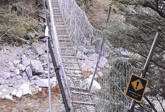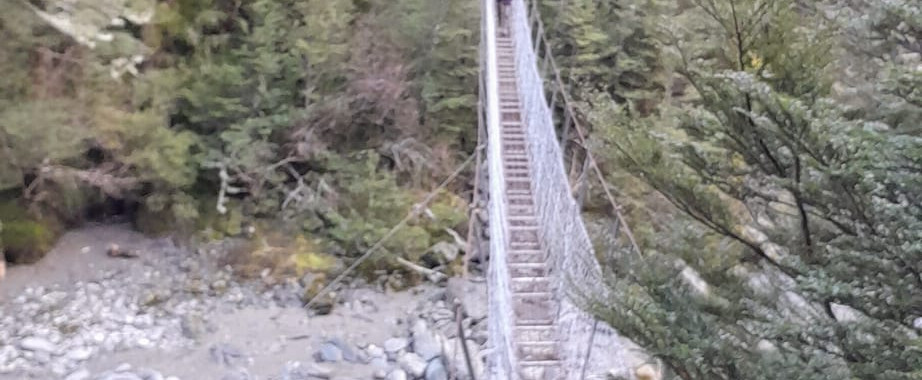 From Red hut it's on to Elcho Hut the chosen spot for the night. Our early arrival gave us the opportunity to explore the North Elcho Valley Tramping Track. The power of the avalanches is evident even in the minor tributaries with major upheaval of the landscape. Our destination was the Swing Bridge high above the Elcho which really must be crossed to appreciate the engineering skills of such a simple structure.