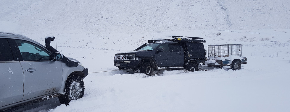 The snow was not much of a problem for high clearance trucks with good tyres and chains on the flat. The near whiteout conditions were tough as it was very easy to drive off a bank or try to climb one that was vertical and very easy to hit a big rock covered in snow. Progress was slow but we had a strong team that worked very well together. We had 4 very experienced passengers that were at the front who helped find the way, shift or scrape snow off big rocks to make them visible. At the back they were helping with directions and recoveries of which there were plenty. What took about 1.5 hrs driving up valley on Saturday took us about 5 hrs to get out on Sunday.